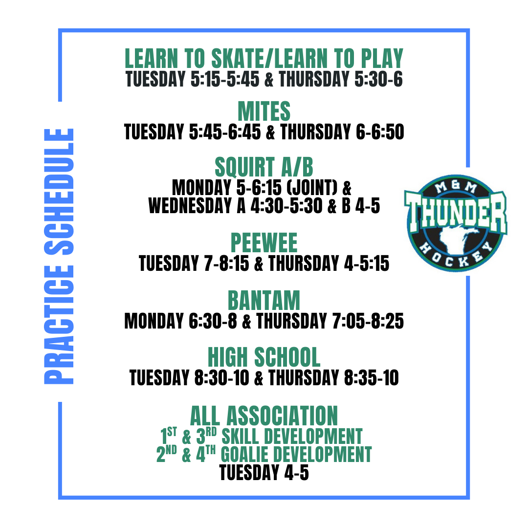 Below is the practice schedule from last season, it may change a little but it will give you insight to a week of hockey for the upcoming year!